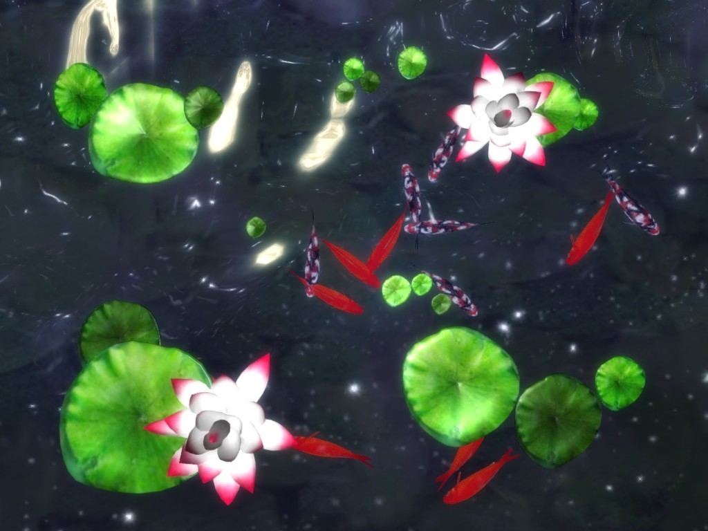 投影畫(huà)面為荷塘水面,水面上有荷葉、荷花,同時(shí)荷花的花瓣散落在池塘中,水面下可以看到些許魚(yú)群在游蕩,當(dāng)觀眾進(jìn)入投影區(qū)域,觀眾走過(guò)的路徑上會(huì)引起水面水紋的波動(dòng),同時(shí)荷葉、荷花會(huì)被波紋帶動(dòng)著向一側(cè)傾斜,水底的魚(yú)群擴(kuò)散。該系統(tǒng)結(jié)合天氣因素,還會(huì)出現(xiàn)雨滴效果,在陰雨天氣進(jìn)行展示又是另一種畫(huà)面。
