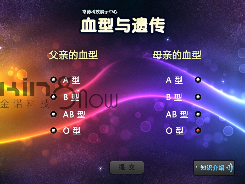 該產(chǎn)品設(shè)置液晶顯示屏,臺(tái)面上內(nèi)嵌IPAD用于觸摸輸入,觀眾在IPAD4上輸入父母的血型后,顯示器中將會(huì)顯示孩子可能出現(xiàn)的血型種類(lèi)。