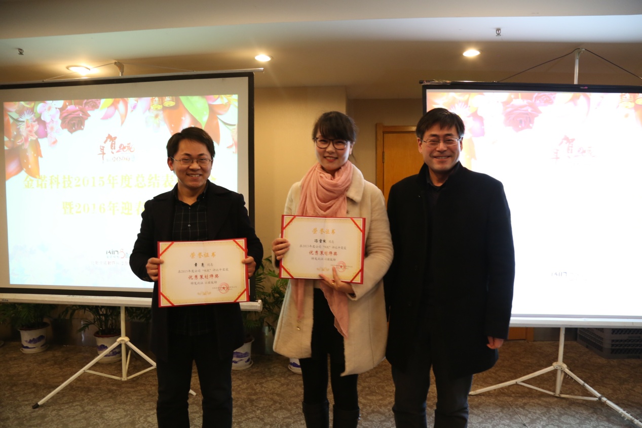 會議宣布了2015年度優(yōu)秀員工、優(yōu)秀作品和優(yōu)秀團(tuán)隊等各項獎項的獲獎名單,田地董事長、戴平副總經(jīng)理、錢瑛副總經(jīng)理、數(shù)建事業(yè)部劉宇經(jīng)理和人力資源部趙凌燕主任等公司高層管理人員向獲獎?wù)呒按眍C發(fā)了獎狀,勉勵獲獎?wù)咴俳釉賲枺俳ㄐ鹿?。田地董事長在會議總結(jié)發(fā)言中指出,2015年公司全體團(tuán)結(jié)一致,取得了良好的經(jīng)營業(yè)績,特別在團(tuán)隊建設(shè)方面取得了長足的進(jìn)步,表現(xiàn)出可喜的精神面貌,也為2016年各項業(yè)務(wù)工作的開展打下了堅實基礎(chǔ),希望全體員工繼續(xù)以“堅持創(chuàng)新創(chuàng)意,傳播科學(xué)、文明”為崇高的事業(yè)目標(biāo),以奮發(fā)向上的工作激情,迎接新一年的挑戰(zhàn),努力向著公司既定的戰(zhàn)略發(fā)展目標(biāo)邁進(jìn)。會上,公司管理人員集體向公司員工拜年,致以節(jié)日的問候。