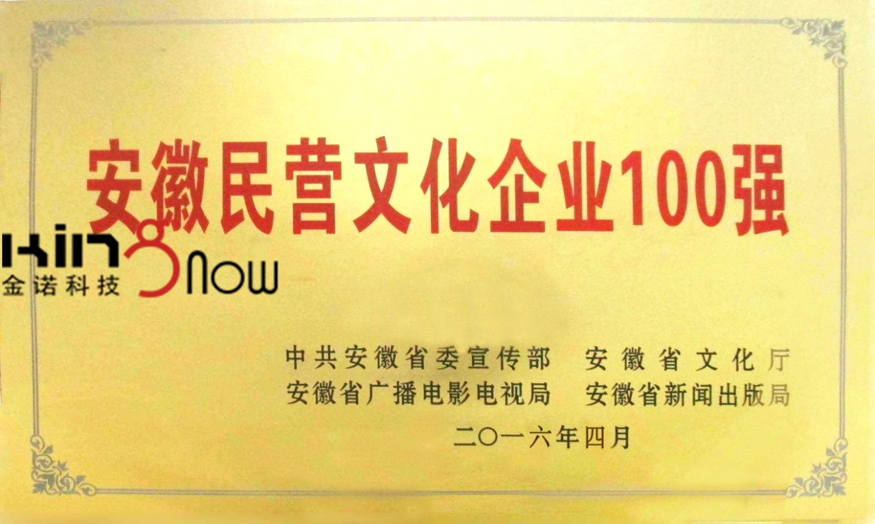 由安徽省委宣傳部、省文化廳、省廣播電影電視局、省新聞出版局共同組織評選的2015年度“安徽民營文化企業(yè)100強”活動近日落下帷幕,合肥金諾數(shù)碼科技股份有限公司連續(xù)第四年獲得此項殊榮。