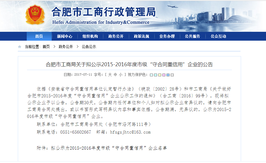 7月11日,合肥市工商局發(fā)布2015-2016年度“守合同重信用” 企業(yè)公示名單,金諾科技再度榮獲“守合同重信用”企業(yè)榮譽(yù)稱(chēng)號(hào)。