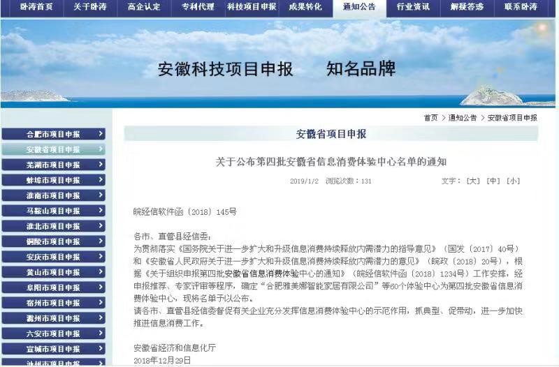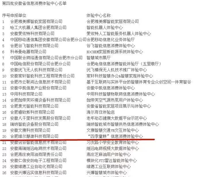 2018年12月29日,由安徽省經(jīng)濟和信息化廳發(fā)布通知,公布了第四批安徽省信息消費體驗中心名單,合肥金諾數(shù)碼科技股份有限公司旗下子公司合肥維爾慧渤科技有限公司經(jīng)營的“四季童耕”探索樂園榮獲安徽省信息消費體驗中心稱號。