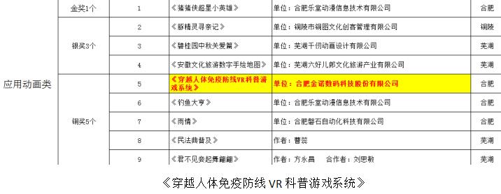 其中,安徽省動(dòng)漫大賽參賽評(píng)選分為社會(huì)組與院校組,設(shè)置影視動(dòng)畫類、漫畫插畫類、應(yīng)用動(dòng)畫類三個(gè)評(píng)獎(jiǎng)?lì)悇e,金諾科技《有巢氏傳奇》和《穿越人體免疫防線VR科普游戲系統(tǒng)》兩部動(dòng)畫作品分別在影視動(dòng)畫類、應(yīng)用動(dòng)畫類作品評(píng)選中榮獲銅獎(jiǎng),以出色的劇情構(gòu)思和精心的創(chuàng)意制作獲得組委會(huì)評(píng)審專家的肯定。