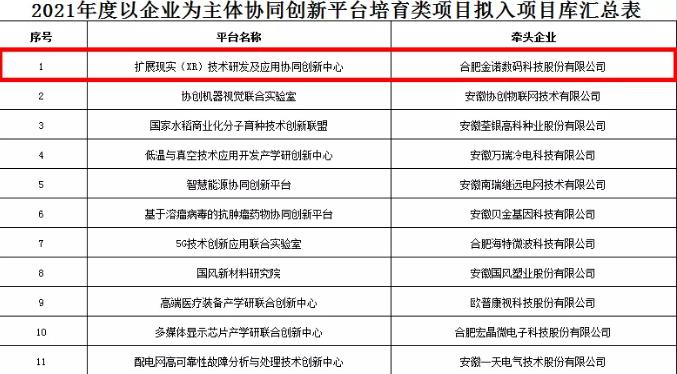 其中,由金諾科技研發(fā)的“基于AIoT技術(shù)智慧科技館管理系統(tǒng)”,作為人工智能領(lǐng)域前沿創(chuàng)新技術(shù),被列入2021年合肥市新技術(shù)榜單;而以金諾科技為牽頭企業(yè)、與安徽大學(xué)聯(lián)合建設(shè)的“擴(kuò)展現(xiàn)實(shí)(XR)技術(shù)研發(fā)及應(yīng)用協(xié)同創(chuàng)新中心”,則歷經(jīng)遴選成功通過(guò)評(píng)審,入選為2021年合肥高新區(qū)以企業(yè)為主體的協(xié)同創(chuàng)新平臺(tái)項(xiàng)目。