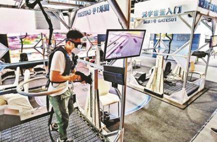 北青報記者來到全球數(shù)字經(jīng)濟大會“開元之境”元宇宙體驗館。首先看到了由專注VR技術(shù)研發(fā)的創(chuàng)新公司STEPVR帶來的全球首款元宇宙登入門“國承1號”。在3平方米左右的空間內(nèi),體驗者站在一個可以360度自由移動的全向運動系統(tǒng)中,戴上超輕薄VR頭顯、穿上帶觸感的震動馬甲,通過這臺機器,可以走進元宇宙的綠洲世界,體驗各類熱門游戲,甚至包括CS、MOBA類需要移動的對戰(zhàn)游戲。在騰訊展臺前,參觀者進入“云游長城”微信小程序,不僅可以遠(yuǎn)眺巍峨壯闊的萬里長城,近距離欣賞長城的一磚一瓦、一草一木,還可以身臨其境地在數(shù)字長城里自由“走動”,體驗在線“爬長城”,甚至還可以在云端體驗修繕長城時需要經(jīng)歷的考古、清理、砌筑、勾縫、磚墻剔補和支護加固等流程。
