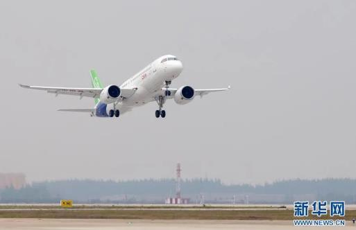 2017年5月5日,國(guó)產(chǎn)大型客機(jī)C919在上海浦東國(guó)際機(jī)場(chǎng)首飛成功。新華社記者丁汀攝