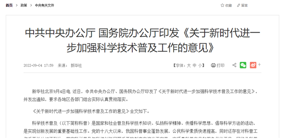 近日,中共中央辦公廳、國(guó)務(wù)院辦公廳印發(fā)《關(guān)于新時(shí)代進(jìn)一步加強(qiáng)科學(xué)技術(shù)普及工作的意見》(以下簡(jiǎn)稱《意見》),要求堅(jiān)持把科學(xué)普及放在與科技創(chuàng)新同等重要的位置,推動(dòng)科普全面融... [2022-09-15]