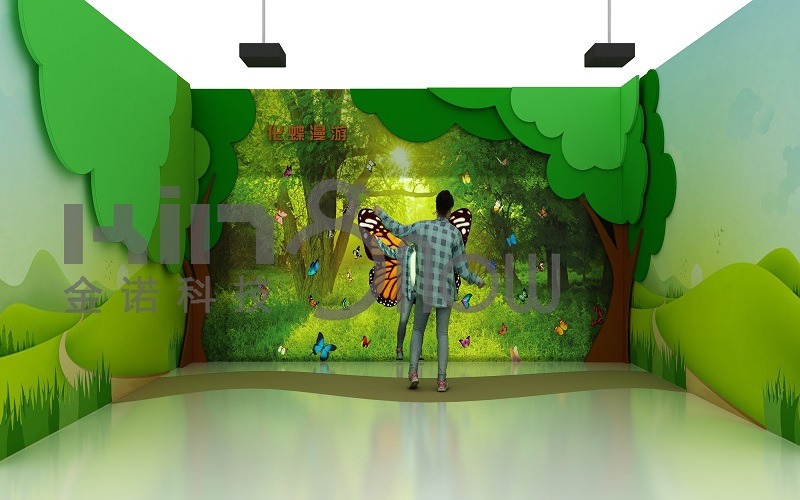 初始狀態(tài),畫(huà)面顯示多種蝴蝶翩翩起舞畫(huà)面,觀眾做出動(dòng)作選擇不同的蝴蝶進(jìn)入場(chǎng)景體驗(yàn)。