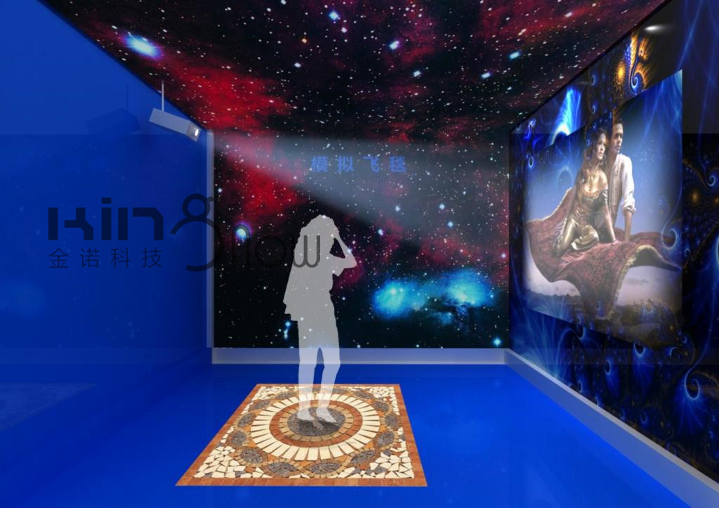 半封閉的展區(qū)內(nèi)一側(cè)展墻上是大幅的星空?qǐng)D像的噴繪,展區(qū)背面是一大塊藍(lán)色背景的展墻,展區(qū)前方的展墻上通過(guò)投影循環(huán)播放飛毯飛行的視頻剪輯。展墻上安裝攝像頭上方有一個(gè)攝像頭,地面擺放一塊地毯,攝像頭對(duì)準(zhǔn)地毯。觀眾可以站上地毯,攝像頭拍攝下站在地毯上的觀眾,通過(guò)視頻摳像技術(shù),將站在地毯上的觀眾與液晶屏上播放的畫(huà)面相結(jié)合,觀眾可以看到自己站在飛毯上,跟隨著飛毯穿越森林,讓觀眾感覺(jué)到自己真的操控飛毯,在魔幻世界中飛行一樣。