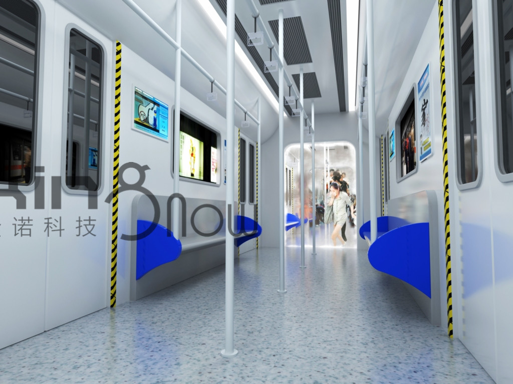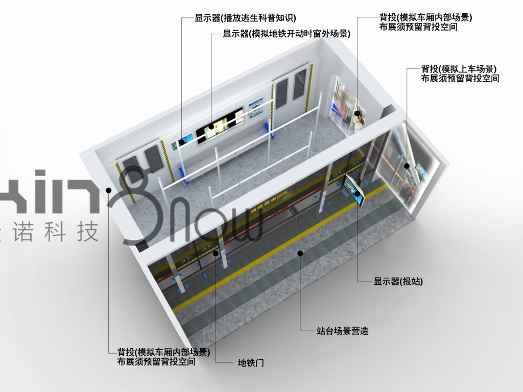 該產(chǎn)品模擬一節(jié)動(dòng)車車廂和動(dòng)車站站臺(tái)的場(chǎng)景,在動(dòng)車車廂內(nèi)和動(dòng)車站臺(tái)上設(shè)置顯示器、廣播。顯示屏上播放二維視頻介紹應(yīng)對(duì)動(dòng)車內(nèi)突發(fā)事件的方法,教導(dǎo)觀眾掌握逃生技巧。廣播語(yǔ)音會(huì)對(duì)突發(fā)事件做出說(shuō)明,提示逃生手段。車廂內(nèi)左右兩側(cè)設(shè)置有投影,當(dāng)觀眾進(jìn)入車廂后,會(huì)播放動(dòng)車車廂內(nèi)部發(fā)生爆的場(chǎng)景的視頻。車廂窗戶設(shè)置顯示屏,播放模擬動(dòng)車開(kāi)動(dòng)時(shí)窗外風(fēng)景視頻。根據(jù)影片劇情的內(nèi)容,在動(dòng)車車廂內(nèi),設(shè)置有燈光閃爍。
