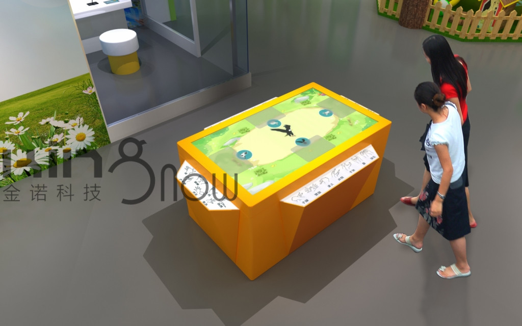 1、造型展臺中間鑲嵌60寸液晶顯示屏,臺面上的液晶屏上方覆蓋一層玻璃,玻璃臺面的四面各有一個手勢識別區(qū),同時可供四人同時參與游戲。在每邊的識別區(qū)旁邊都用圖文介紹手影藝術,注解手影的施展方法。