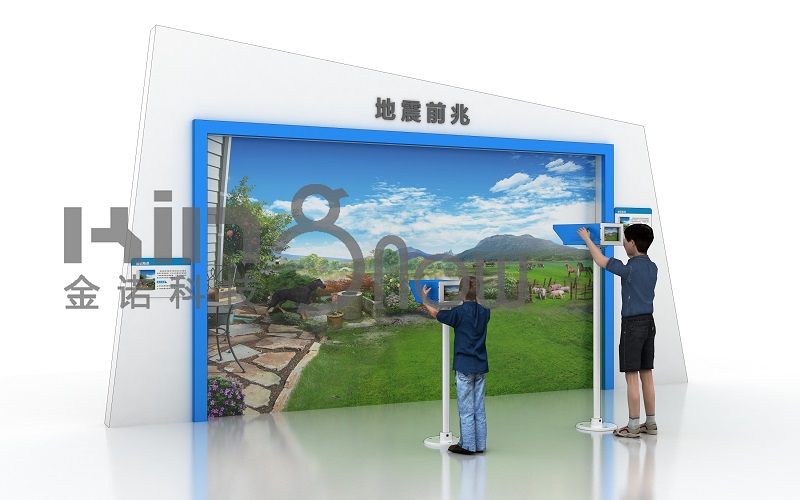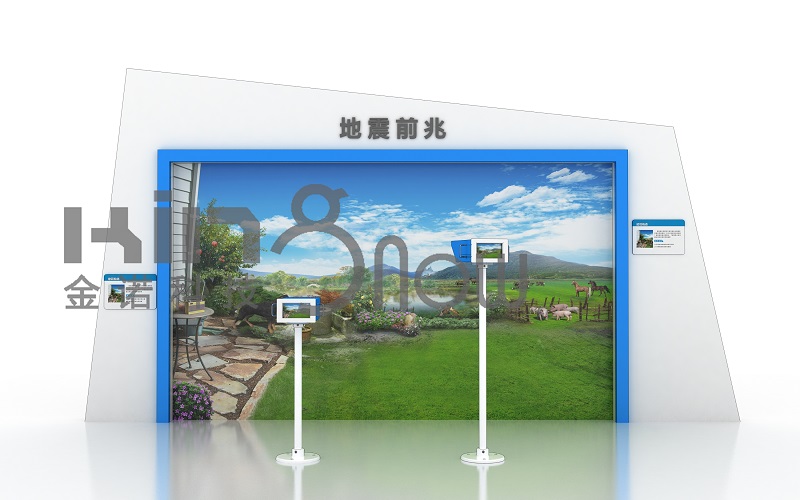 產(chǎn)品功能:該產(chǎn)品的展示墻面上貼有各種牲畜、魚(yú)類(lèi)、野生動(dòng)物等在地震發(fā)生前的異常畫(huà)面的壁畫(huà),壁畫(huà)前方設(shè)置兩臺(tái)觀景機(jī),觀景機(jī)結(jié)構(gòu)可實(shí)現(xiàn)左右轉(zhuǎn)動(dòng),180度觀看壁畫(huà)中的觀景內(nèi)容。