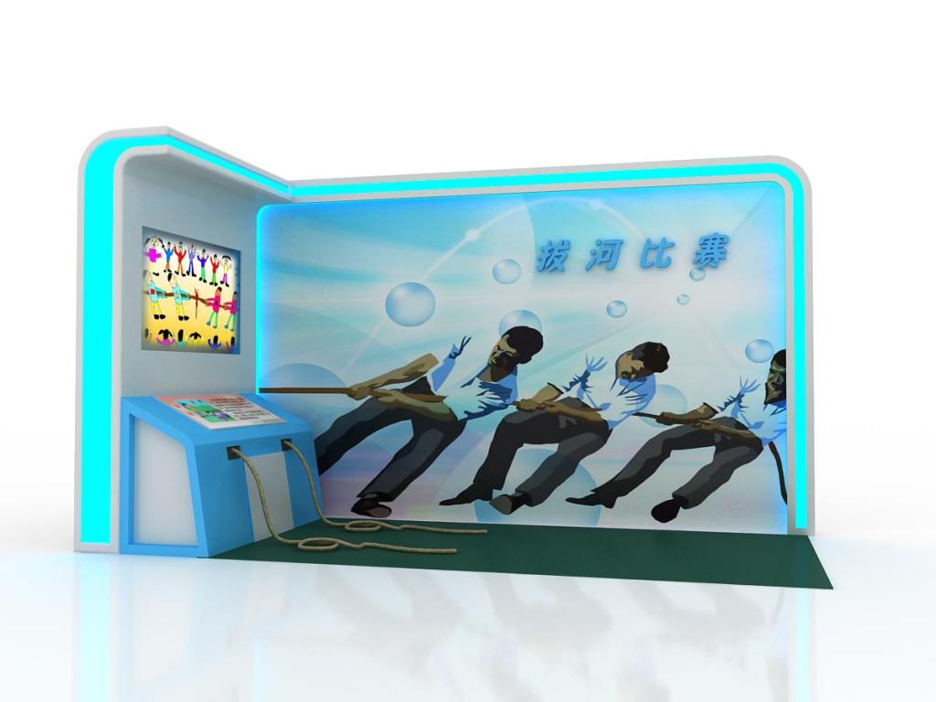 展項設(shè)置成模擬拔河區(qū)的造型??臻g正面展墻懸掛50寸液晶電視,在電視下方放置一個運動操作臺,操作臺連接兩根拔河用的繩子。觀眾拉動任何一根繩子,計算機采集到信號后,游戲開始,系統(tǒng)提示觀眾正對攝像頭進行摳像,攝像頭會捕捉觀眾的頭像,約3秒后,將觀眾的頭像顯示在Q版動畫小人(如大頭娃娃)的臉上,此時電視屏幕上會出現(xiàn)兩個Q版人準備拔河的畫面,兩人各站一邊,中間有一條界線,繩子上綁著紅色小氣球。屏幕上出現(xiàn)游戲倒計時(5秒)讀秒,系統(tǒng)通過傳感器接收與分析觀眾使出力的大小等數(shù)據(jù),真實的反映到屏幕的畫面中。 操作說明: 1、觀眾拿起拔河用的繩子,在系統(tǒng)提示游戲開始后,用力向后拉; 2、根據(jù)游戲規(guī)則,畫面中出現(xiàn)一方把繩子上的氣球的位置越過系統(tǒng)設(shè)定點時,游戲結(jié)束,畫面顯示觀眾成績。