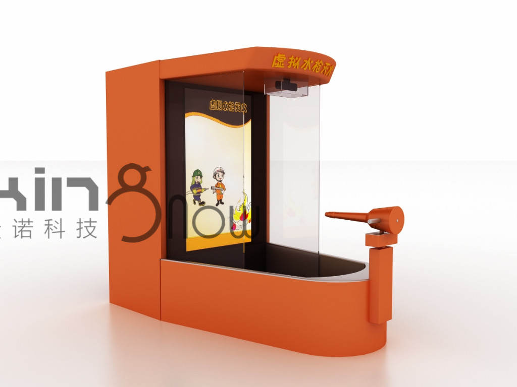 通過多媒體場景模擬火災(zāi),參與者操作水槍進行滅火演習(xí)。該展項直接將消防水槍改制為展品所用,噴水嘴可隱蔽調(diào)節(jié);顯示屏幕用鋼化玻璃封閉,在游戲過程中,當(dāng)水槍朝屏幕噴出水時,運用電容觸摸屏技術(shù),做到精確的檢測指向,介紹相關(guān)的消防知識。水流流向玻璃下方的水槽中,水槽的水面上覆蓋不銹鋼網(wǎng)罩,具備可以排盡積水排水口,保證了換水的方便。