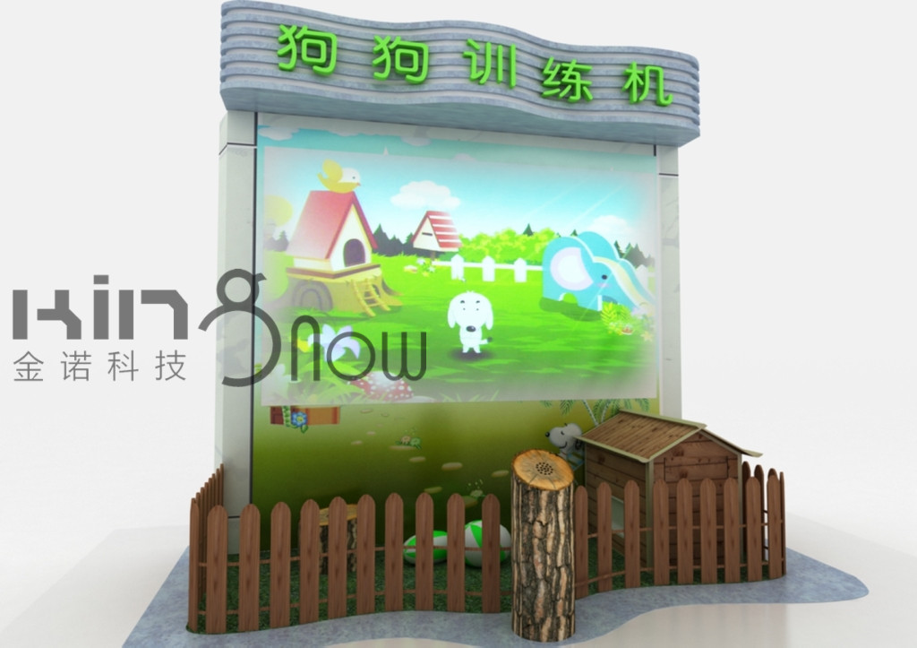 前方設置一個樹樁造型的話筒,觀眾通過話筒與屏幕中的虛擬動物進行互動,體驗訓練動物的技巧與方法。屏幕中隨機出現(xiàn)一條漂亮的虛擬狗,正搖著尾巴,看著你。觀眾對著話筒喊出話語,訓練虛擬狗去尋找畫面之外的目標,如骨頭或小彩球等。例如:向右轉、過河、跳躍、趴下、回家、上滑梯、算數(shù)等,畫面中的卡通狗作出相應反應,例如:觀眾問:1+1等于幾?小狗會“汪汪”的。